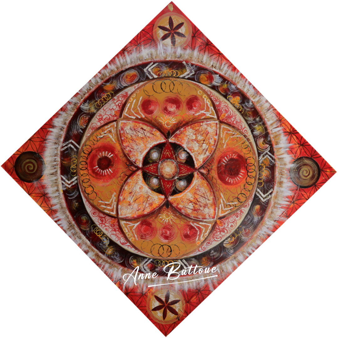 Pour  “CHAM-ÂME”, j’ai tracé une forme géométrique faite de cercles entrelacés à laquelle j’ai choisi de m’imposer les couleurs rouges, ocres et terre de sienne. Un travail sur ce qui nous relie et nous ancre, la Terre! Le chakra « Racine », aussi appelé Muladhara en sanskrit.
