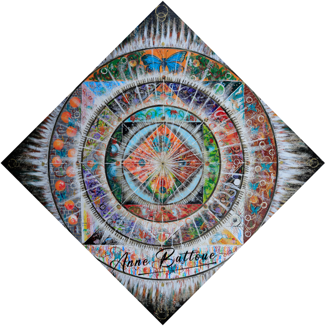 Pour ce faire, j’ai divisé la thématique en trois sujets :  “Origines”, ”Transmission” et “Inspiration”. Chaque tableau est composé de symboles et de couleurs similaires, seule la construction des figures change.