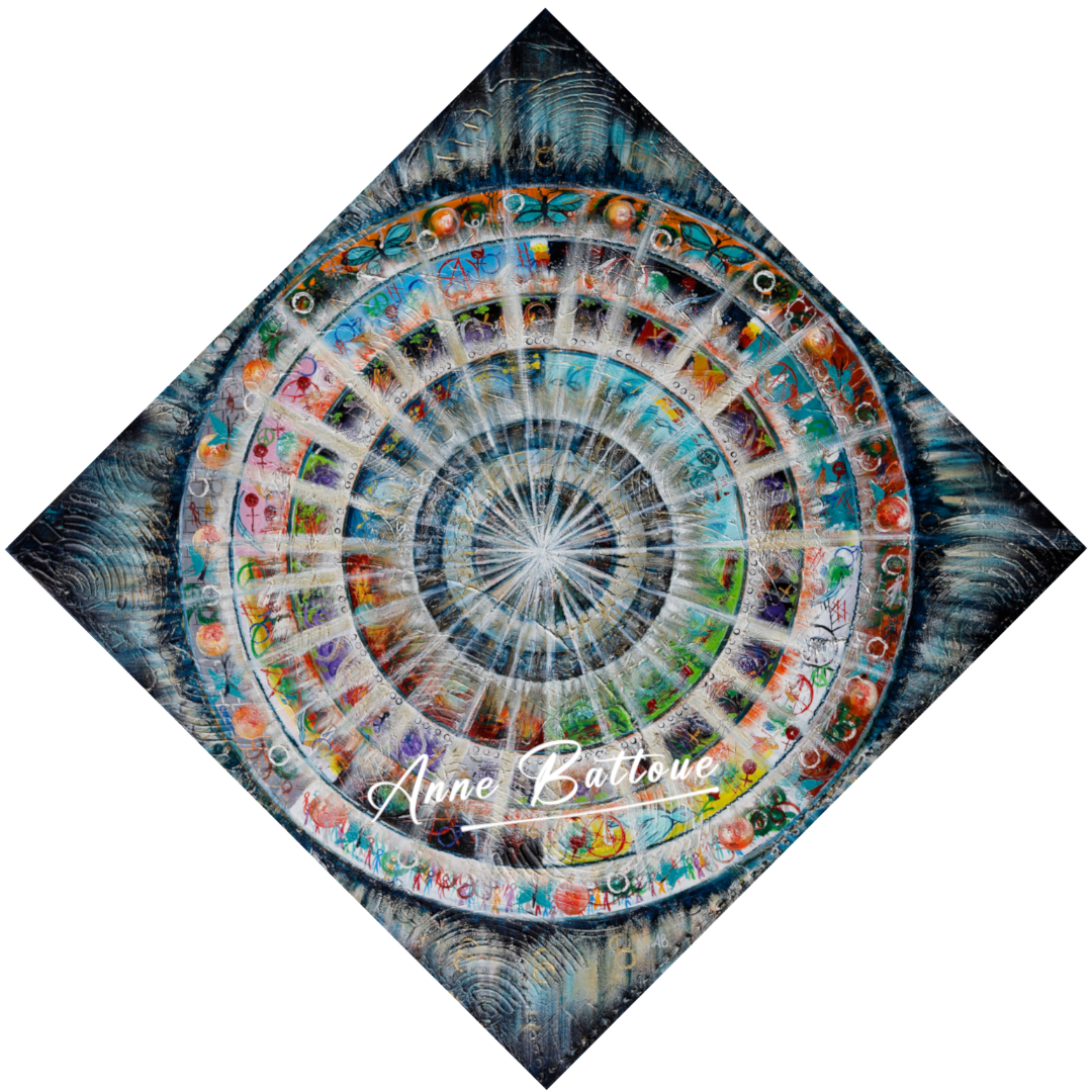 Pour ce faire, j’ai divisé la thématique en trois sujets : “Origines” ,”Transmission” et “Inspiration”. Chaque tableau est composé de symboles et de couleurs similaires, seule la construction des figures change.